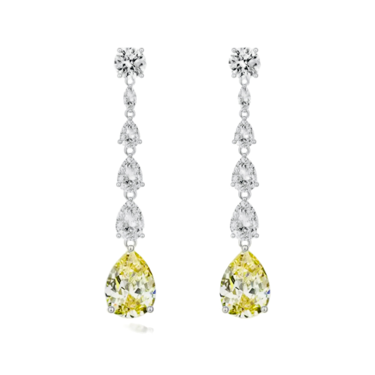 It is pear-shaped with marquise-cut diamonds in platinum and 9k white gold vermeil dangle earrings. Doesn’t this look dazzling? The yellow in the drop stands out, making it unique, and it will look stunning paired with a chic little black dress or even a yellow dress. Carat total weight 6.31 2 Fancy Light Yellow Pear shape diamonds 4 Marquise-cut diamonds 1.25 Carat total weight. ✨✨✨