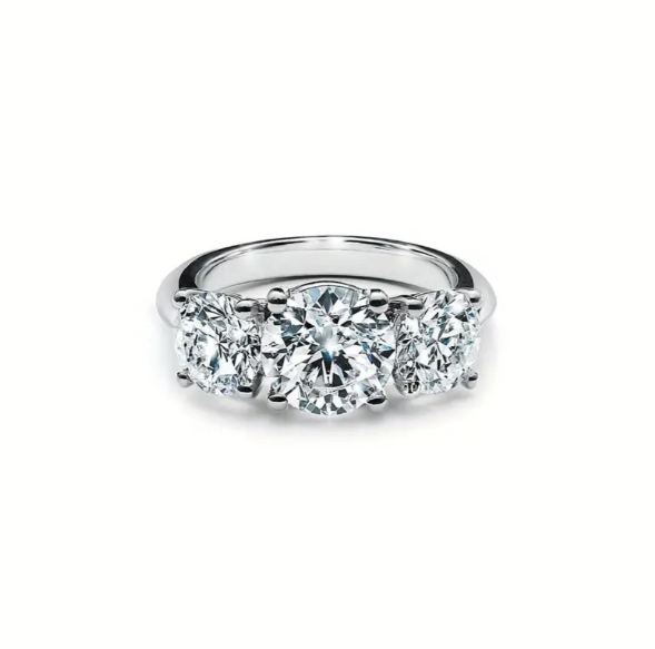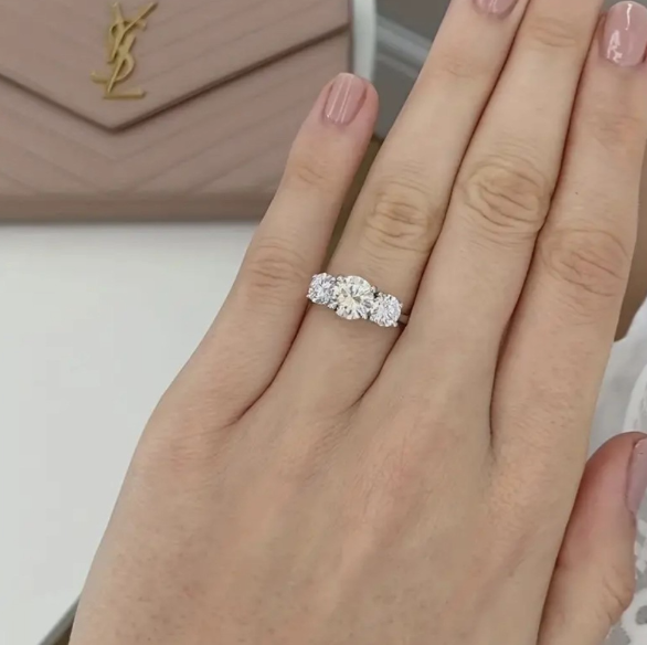This captivating Moissanite ring has three times the beauty and grace. Anastasia is a sensational ring showcasing a trio of glittering round cut stones, all prong set atop a brightly polished 18-karat white gold band. 1ct center stone complemented by two 0.5ct side stones, this ring boasts a 2-carat total weight diamond equivalent. ✨✨✨