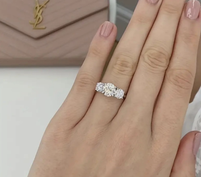 This captivating Moissanite ring has three times the beauty and grace. Anastasia is a sensational ring showcasing a trio of glittering round cut stones, all prong set atop a brightly polished 18-karat white gold band. 2ct center stone complemented by two 1.0ct side stones, this ring boasts a 4-carat total weight diamond equivalent. ✨✨✨