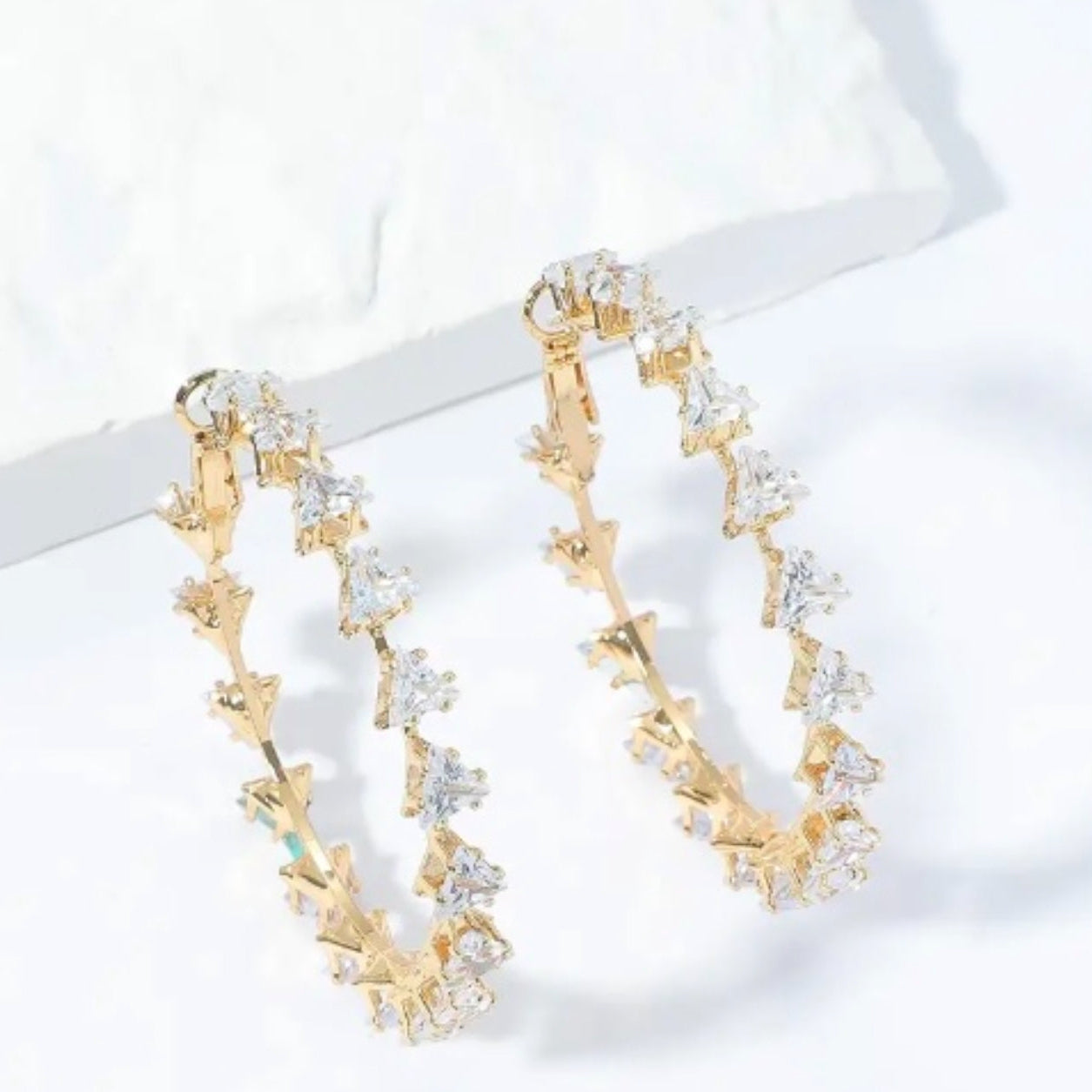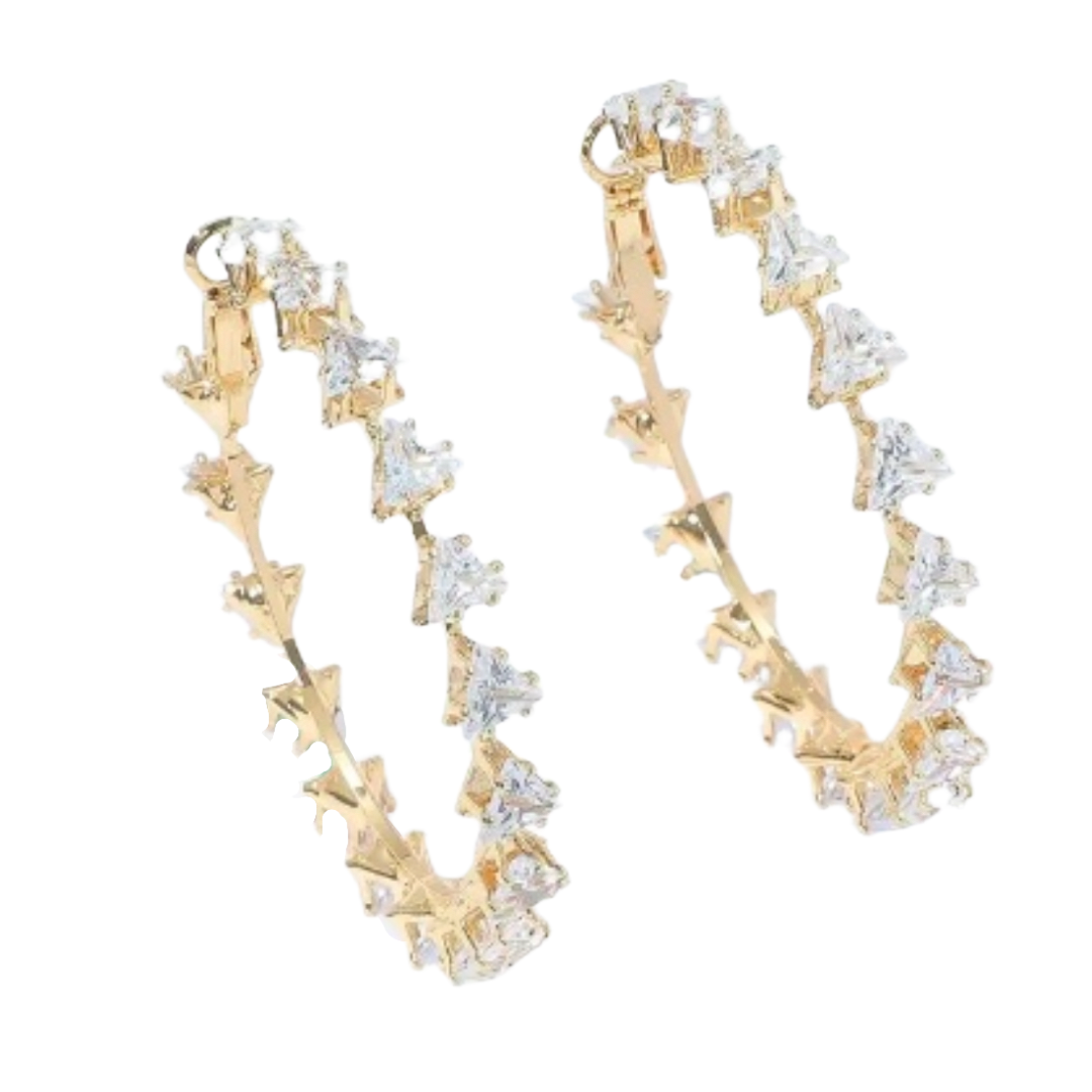 Our hoops are the star of the show! Gleaming in 4.00 ct. t.w. triangle brilliant-cut Moissanite diamonds from the all around, these earrings are perfect for practically any ensemble or event. A polished sterling silver setting makes them affordable, and just as glamorous as ever. Hanging length is 2″, Omega post. ✨✨✨