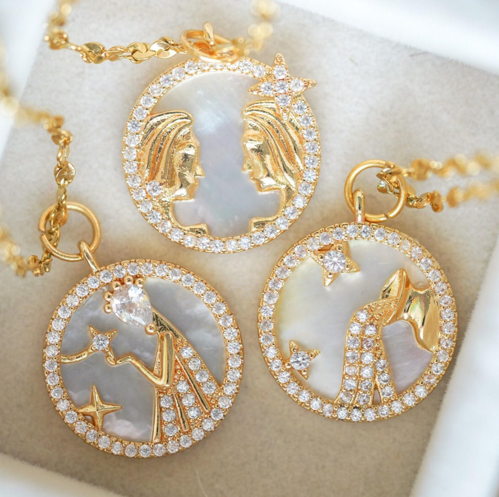 Channel bold, intuitive, cosmic energy with the Celestial zodiac medallion necklace. These radiant gold pendant features a sparkling zodiac motif surrounding by two luminous stars, mother of pearl symbolizing protection, strength, and destiny. Crafted with high-shine gold and micro-pave moissinate diamonds, it brings just the right touch of shimmer to elevate any outfit.