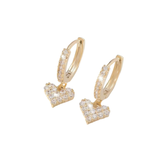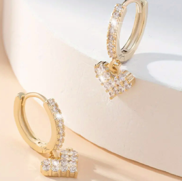 These Gold Pave Mossanite Diamond Heart Mini Hoop Huggie Earrings feature pave moissanite diamond set in 14K yellow gold. It’s okay to be a little obsessed with hoop earrings! Especially when they have a dangling heart charm! These dainty earrings hug the ear, and the heart charm adds more love to the look. These would make a great cartilage earring. You can also use the heart charm and huggies alone themselves.