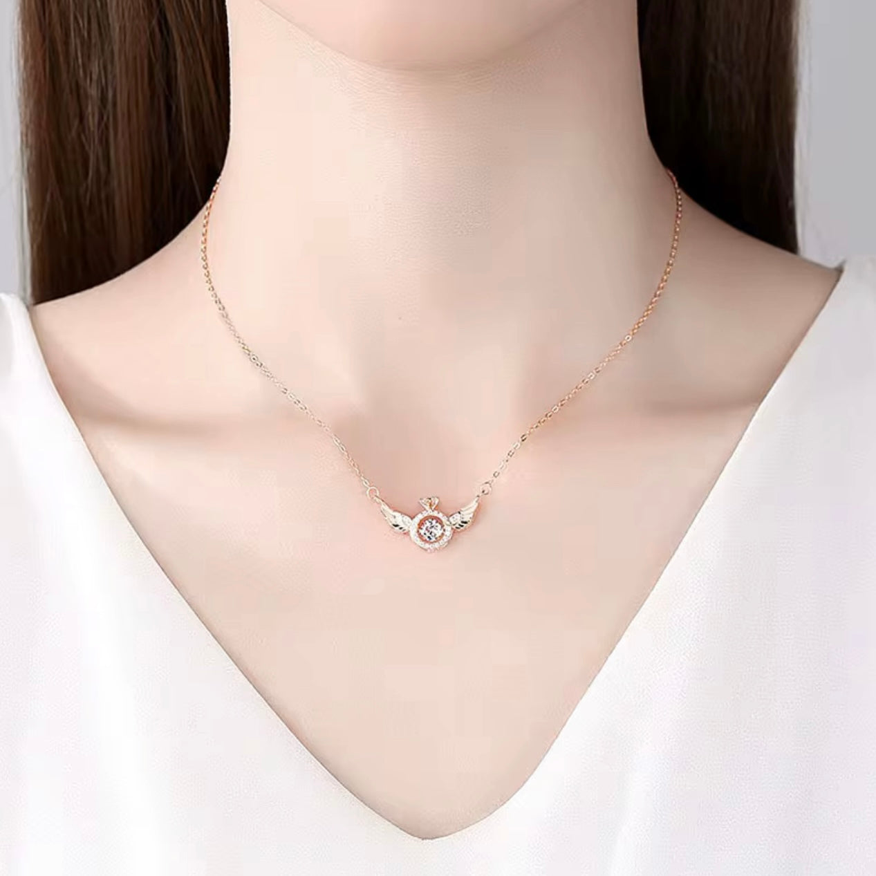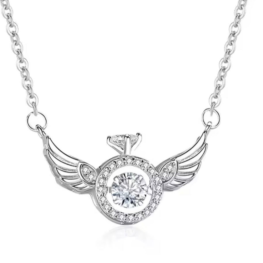 Introducing our stunning Dancing Diamond Inside a Ring set in Angel Wings Necklace. This exquisite piece features a shimmering dancing diamond encased within a delicate ring, all surrounded by intricate angel wings. The shiny and beautiful design of this necklace will surely catch the eye and add a touch of elegance to any outfit. Elevate your style and embrace your inner angel with this unique and dazzling necklace.