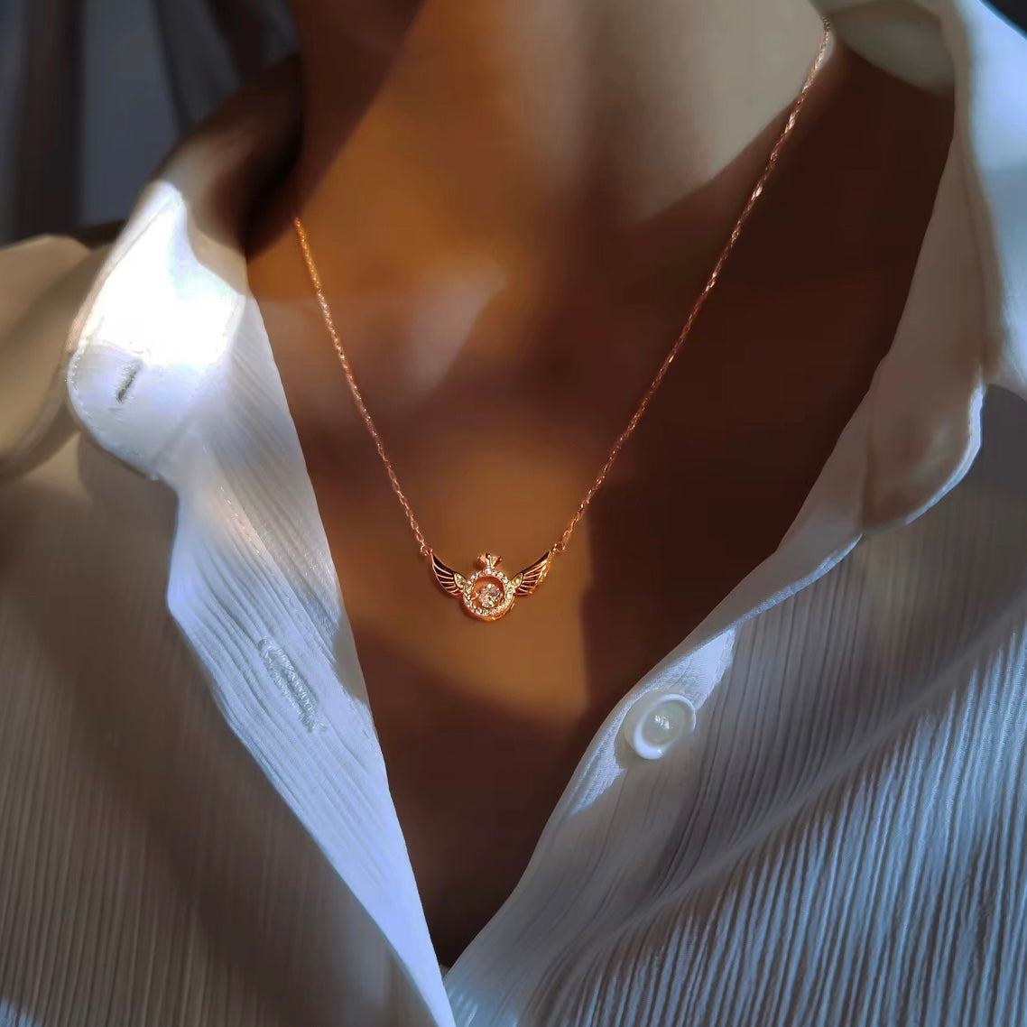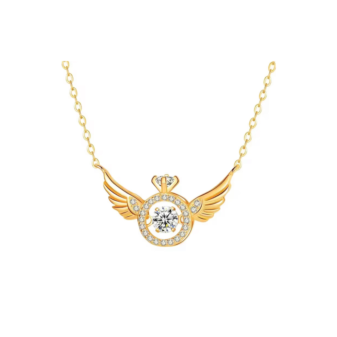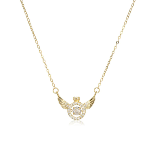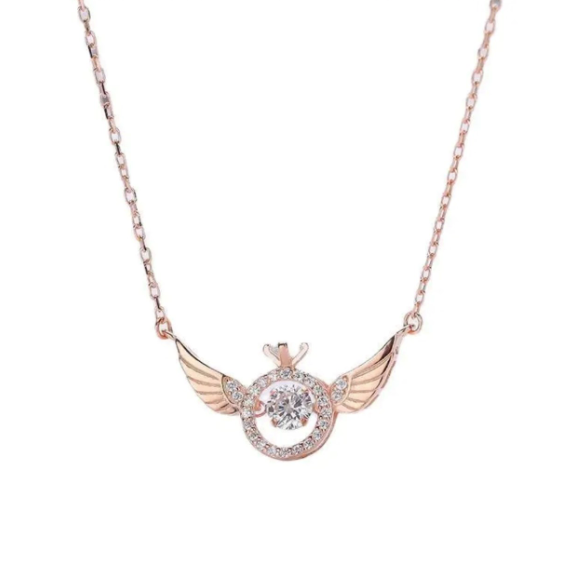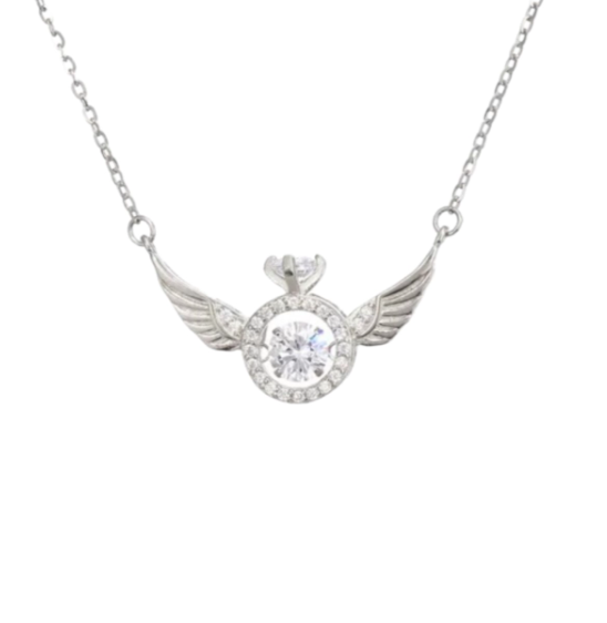 Introducing our stunning Dancing Diamond Inside a Ring set in Angel Wings Necklace. This exquisite piece features a shimmering dancing diamond encased within a delicate ring, all surrounded by intricate angel wings. The shiny and beautiful design of this necklace will surely catch the eye and add a touch of elegance to any outfit. Elevate your style and embrace your inner angel with this unique and dazzling necklace.