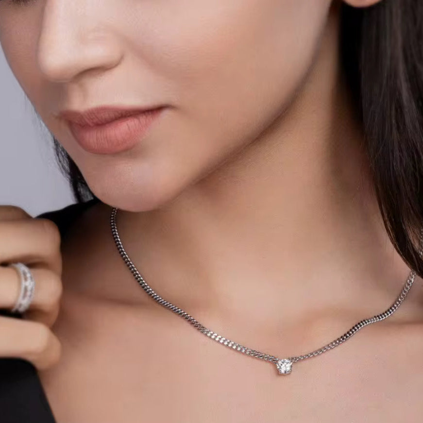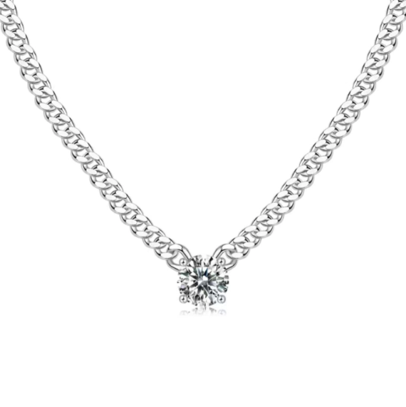 This simple and classic solitaire necklace showcases a beautiful round white Moissanite diamond set in 18K white gold. The pendant hangs from an 18-inch Cuban platinum chain and is secured with a lobster clasp. ✨✨✨