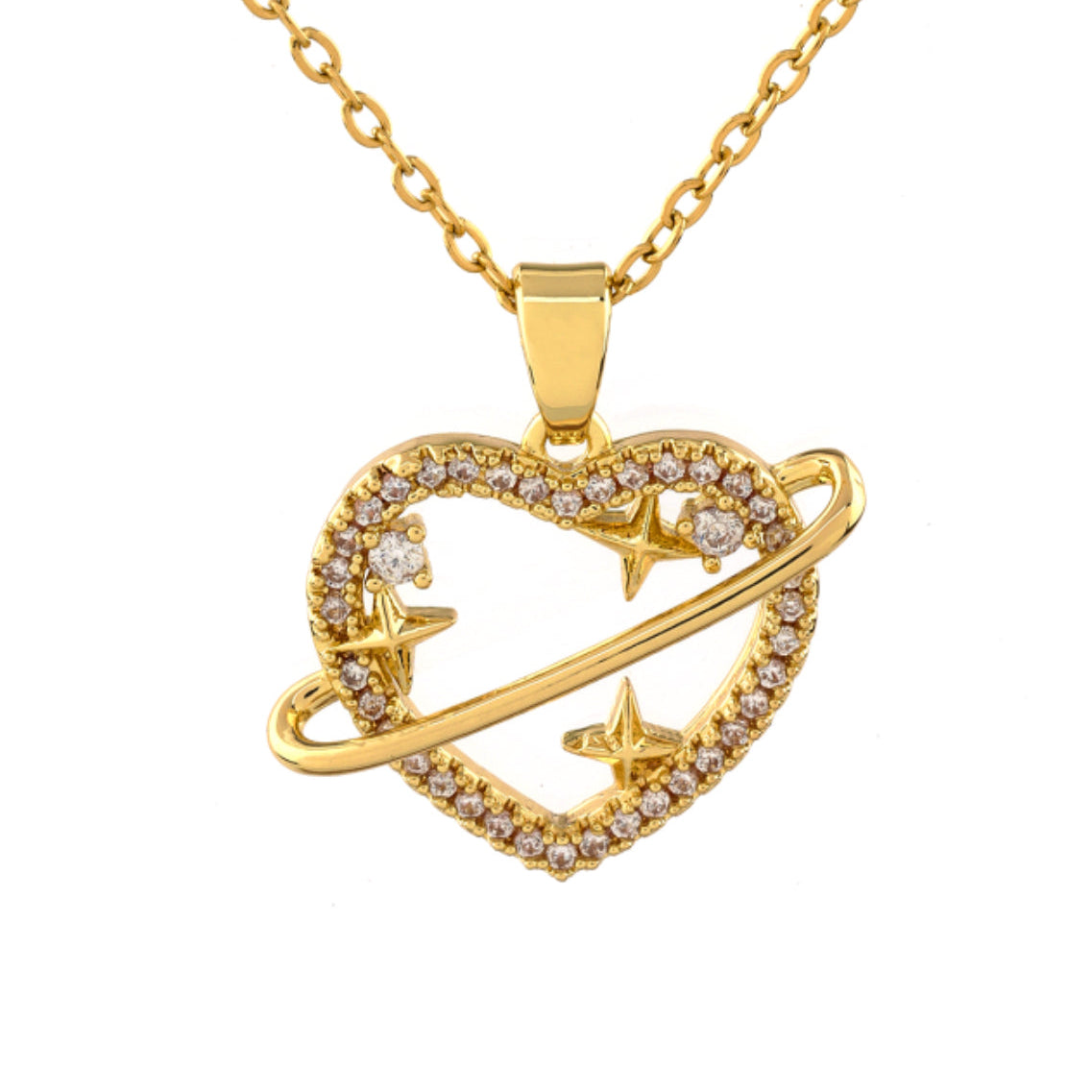 A dreamy fusion of romance and celestial magic. This stunning heart-shaped pendant is outlined with shimmering moissinate diamonds and adorned with mini star accents, all wrapped in a sleek orbital ring for a uniquely cosmic touch. crafted in polished gold vermeil, this piece captures the feeling of being loved beyond the stars. Perfect for layering or wearing solo, it adds the perfect amount of sparkle to any look.