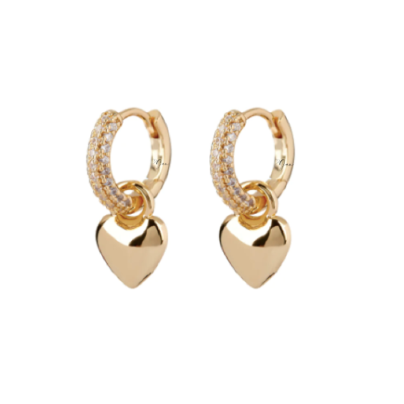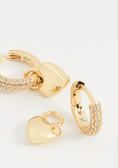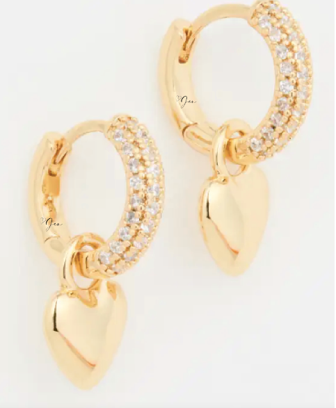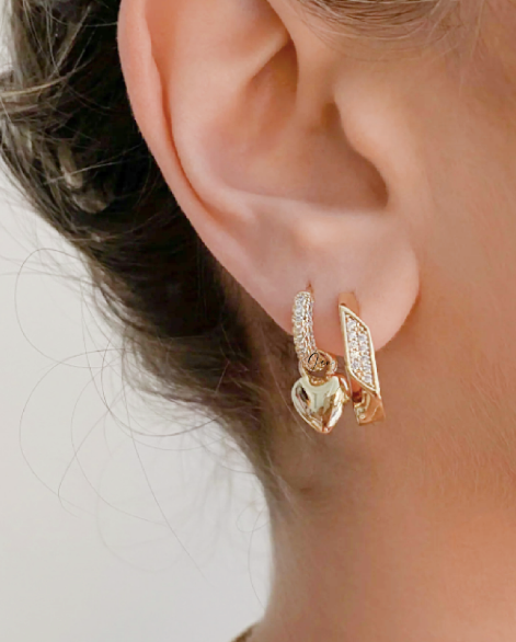 A beautiful pair of hoop earrings for a special occasion or just because, these 14K Vermeil Gold earrings feature a classic hoop thats’ detailed with paved Moissanite Diamonds and a puffy love heart charm hanging sweetly underneath that is removable.