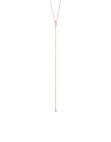 18K gold white Moissanite diamond vertical bar lariat necklace with a single bezel set white diamond dangling at the bottom. ✨✨✨