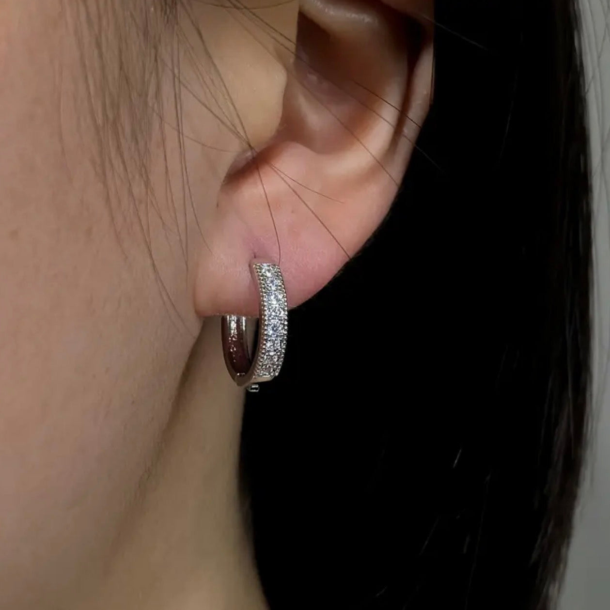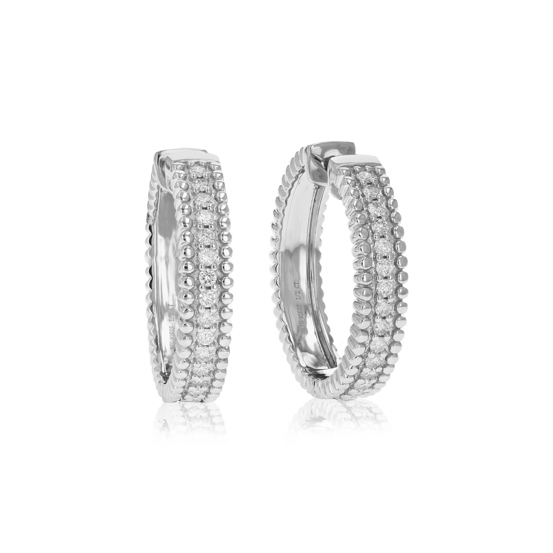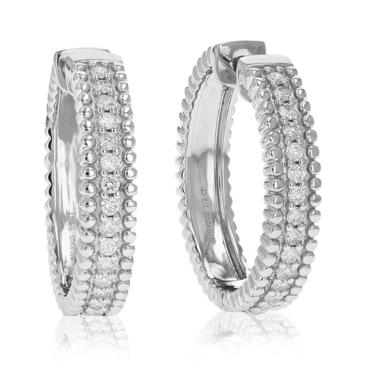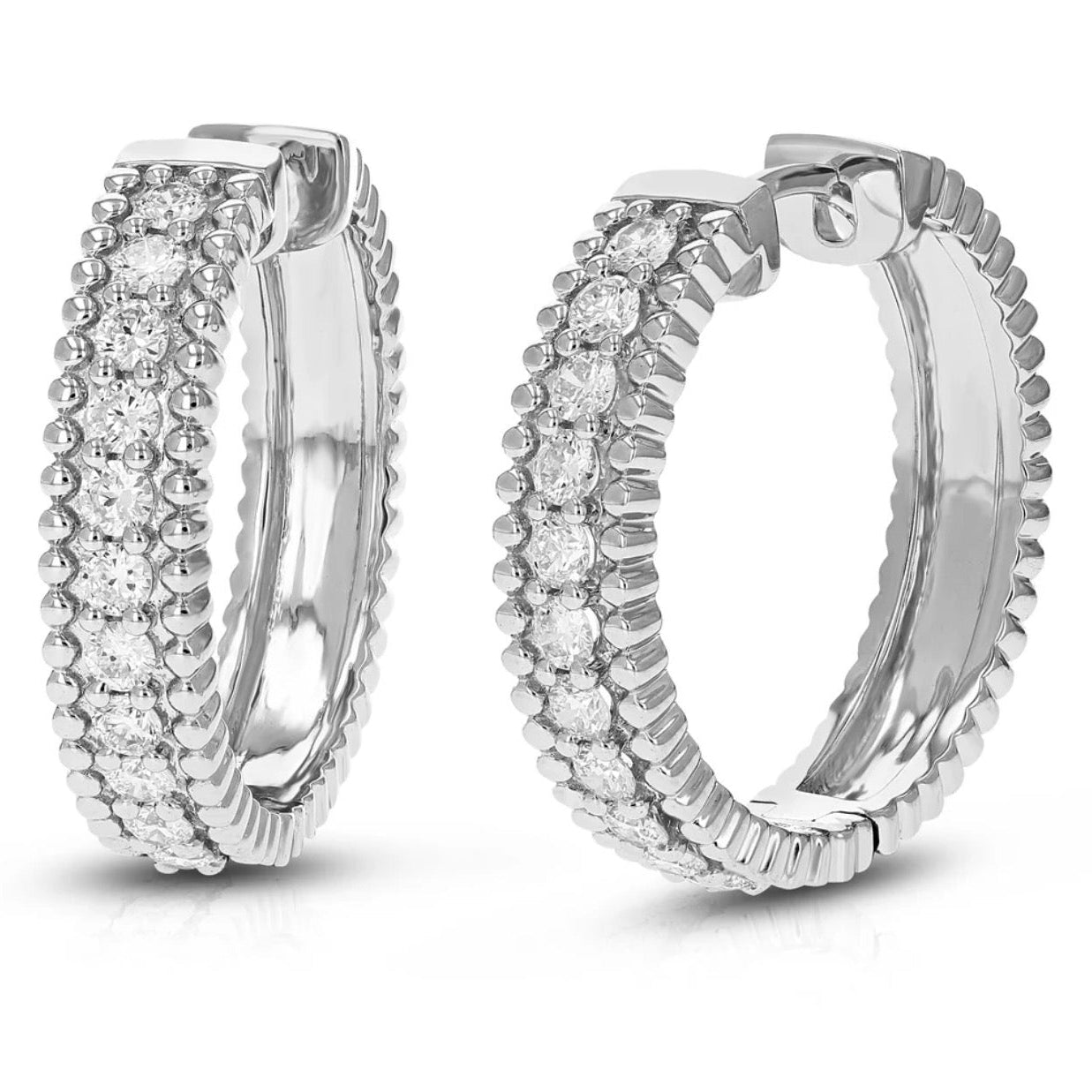 A classic chunky inside-outside hoop earring featuring pave’ round brilliant cubic zirconia stones, these simple, sparkly, and OH CHIC so chic earrings that are the perfect complement to any outfit. 14k White Gold Hinged Hoop Inside Out Earring.