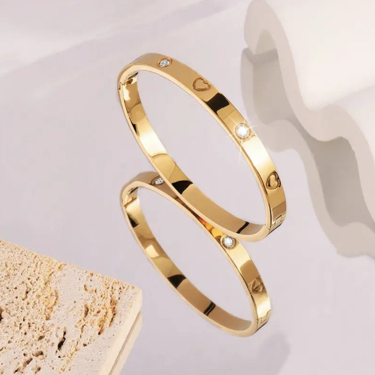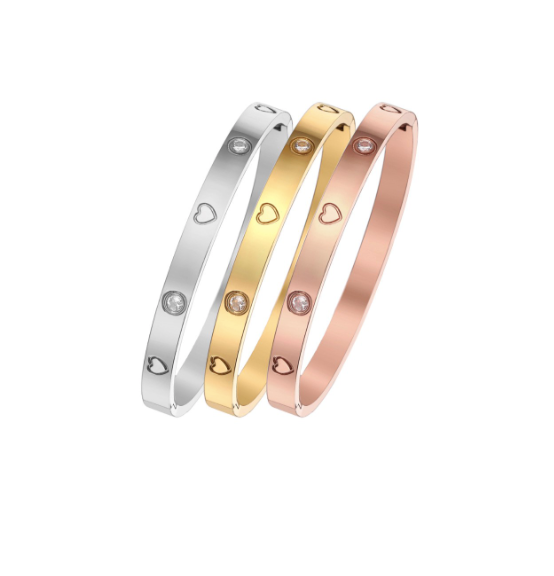 This 14K gold/rose gold/white gold bangle is embellished with six clear of our best Moissanite diamonds and hearts in between. Arranged in an attractive and pleasing pattern, they catch the light from every angle. Whether you adore the stone’s brilliant shine or the steady shimmer, this bracelet gives you everything you want. It’s sleek style and modern silhouette go well with other bangles or bracelets to create an on-trend stacked look. ✨✨✨
