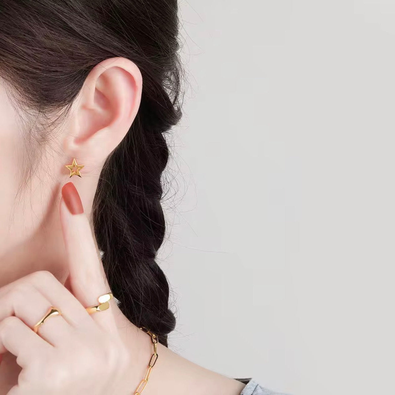 Our beautiful Rockstar cut-out star earrings are so cute. A beautiful shiny star is on the front of the huggie hoop that gently hugs the ear. 18K Vermeil Gold. ✨✨✨