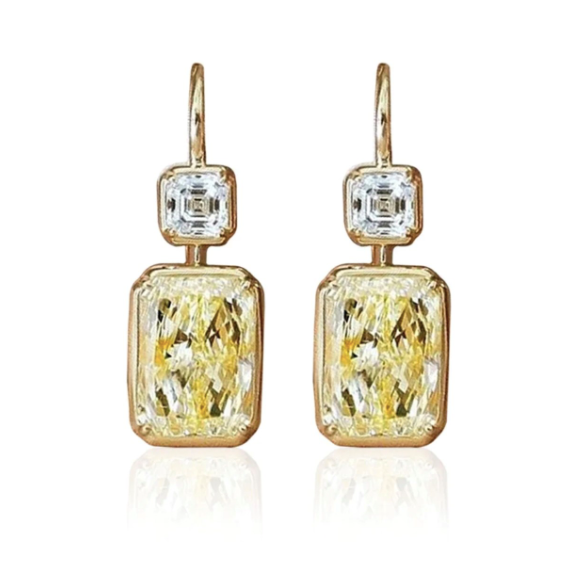 With a honey-golden glow, these Emerald-cut citrine earrings maintain a warm radiance. The drops also glisten with a Moissanite Diamond round in 14kt yellow gold vermeil. Fish hook drop earrings.✨✨✨