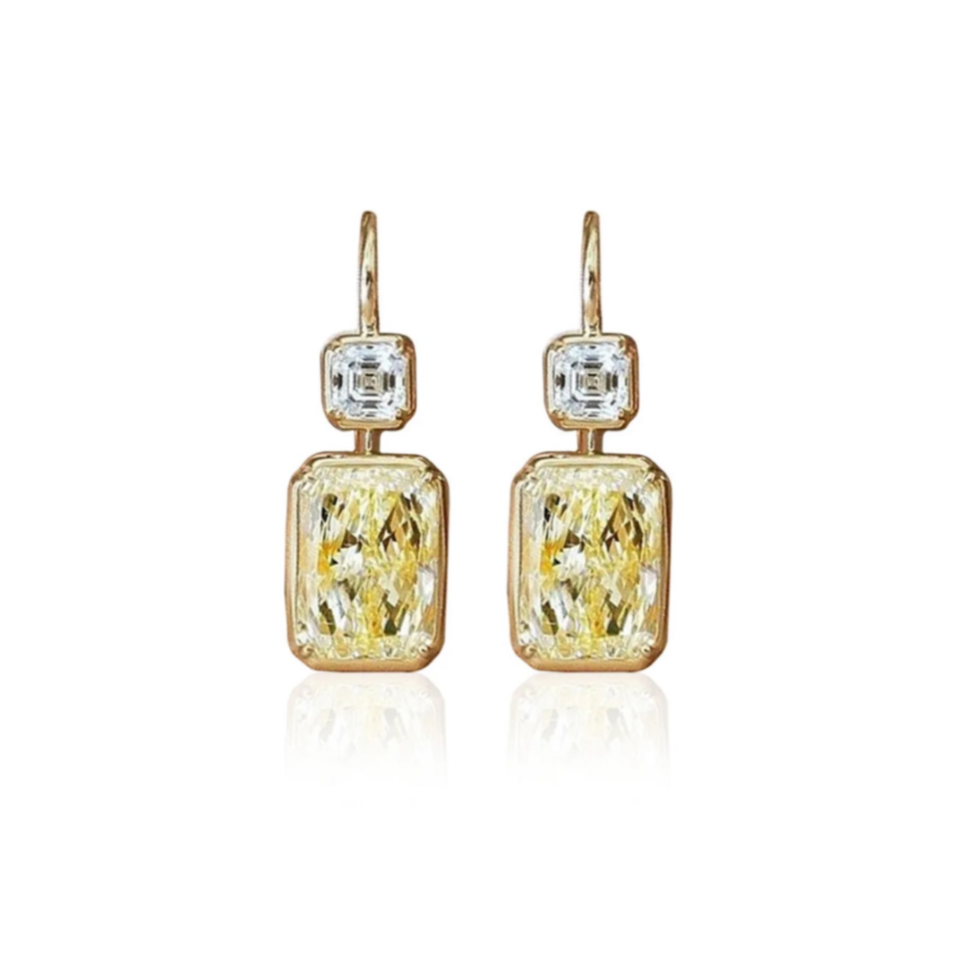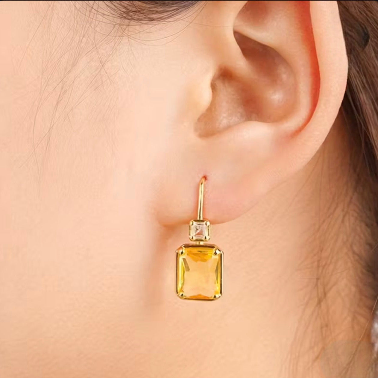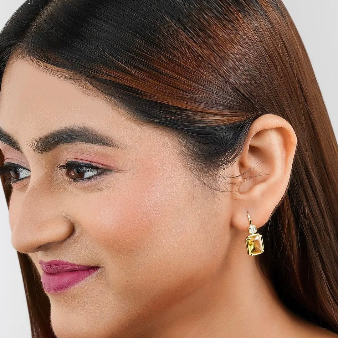 With a honey-golden glow, these Emerald-cut citrine earrings maintain a warm radiance. The drops also glisten with a Moissanite Diamond round in 9kt gold vermeil. Fish hook drop earrings.✨✨✨