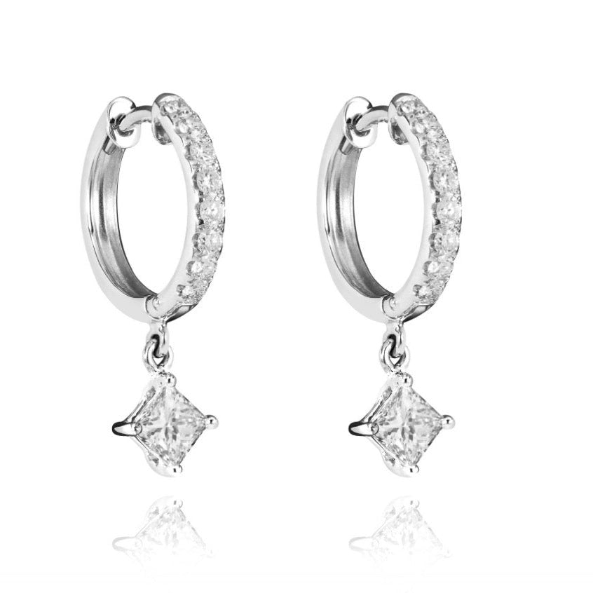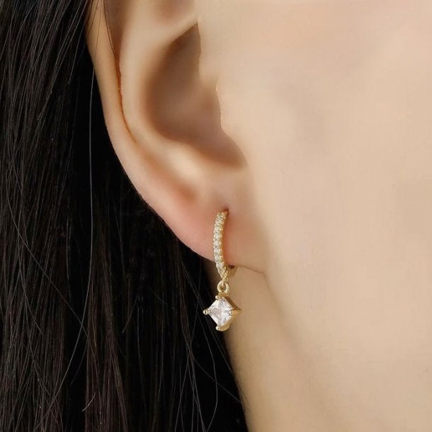 A classic huggie with a modern twist! The Veria Huggie pairs paved Moissanite diamond-filled hoop with a larger dangling Moissanite diamond for that extra oomph. You can dress these up or down. ✨✨✨